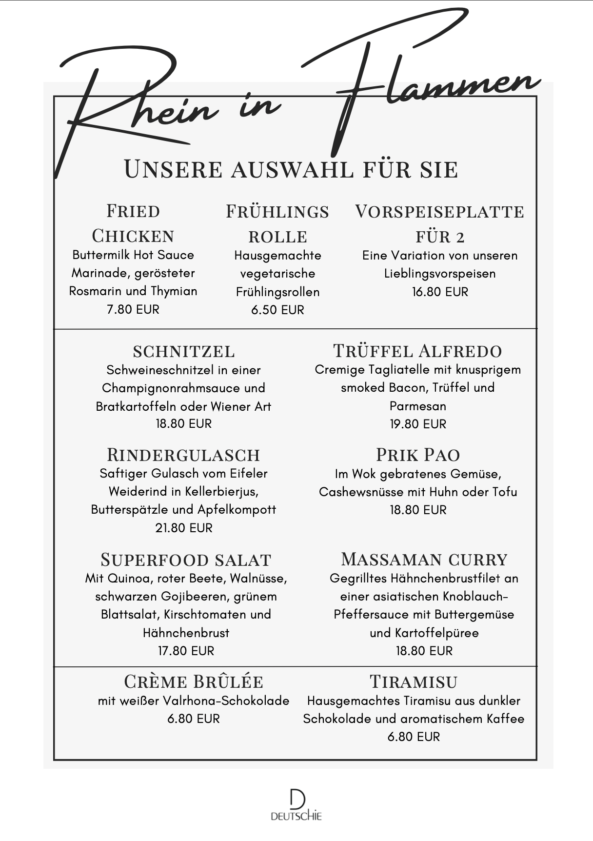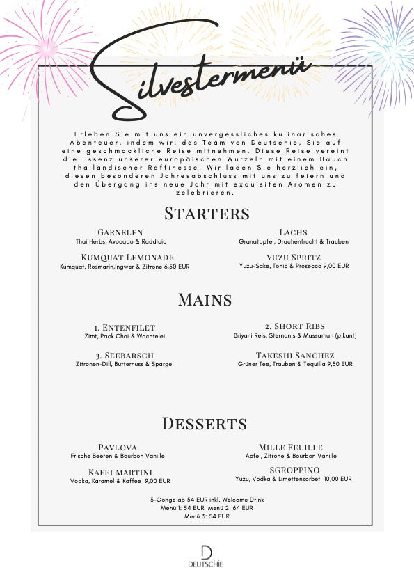 Das chinesische Neujahr ist das heiligste Fest in China. Es wird seit Tausenden von Jahren in vielen Ländern von Ost bis West, von Nord bis Südasien gefeiert, bei denen es darum geht, das Schlechte und das Alte zu beseitigen und dafür das Gute und das Neue willkommen zu heißen. Um dies zusammen zu feiern, bieten wir im Deutschie ein 3-Gänge-Menü mit Elementen aus der westlichen Welt und der chinesischen Küche und einem Begrüßungsgetränk an.