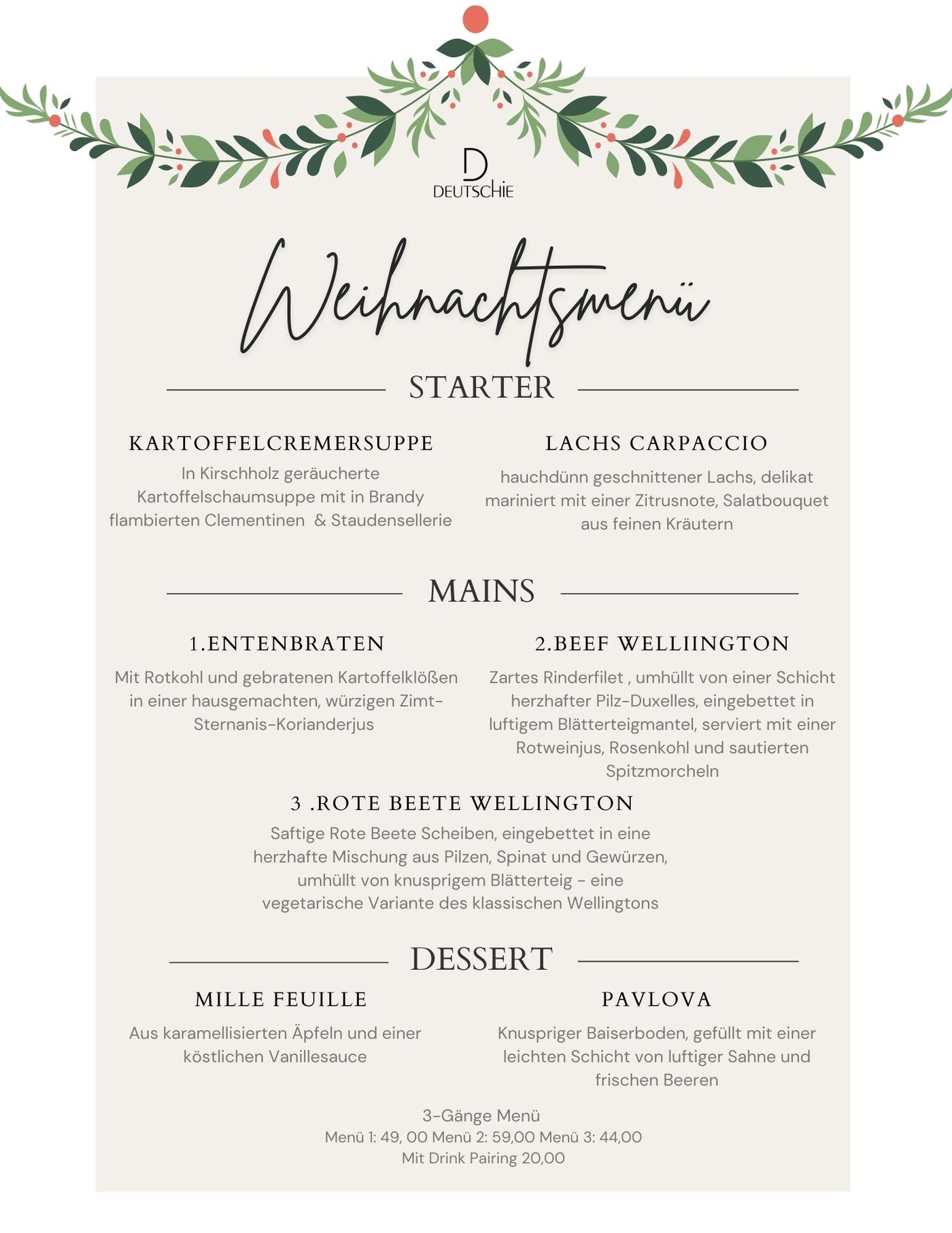 Erleben Sie den Zauber von Weihnachten im Restaurant Deutschie. Unser festliches Menü bietet eine köstliche Auswahl an traditionellen und modernen Gerichten, zubereitet mit den besten Zutaten. Von saftigen Braten bis hin zu verführerischen Desserts ist jeder Bissen eine Feier der Saison.